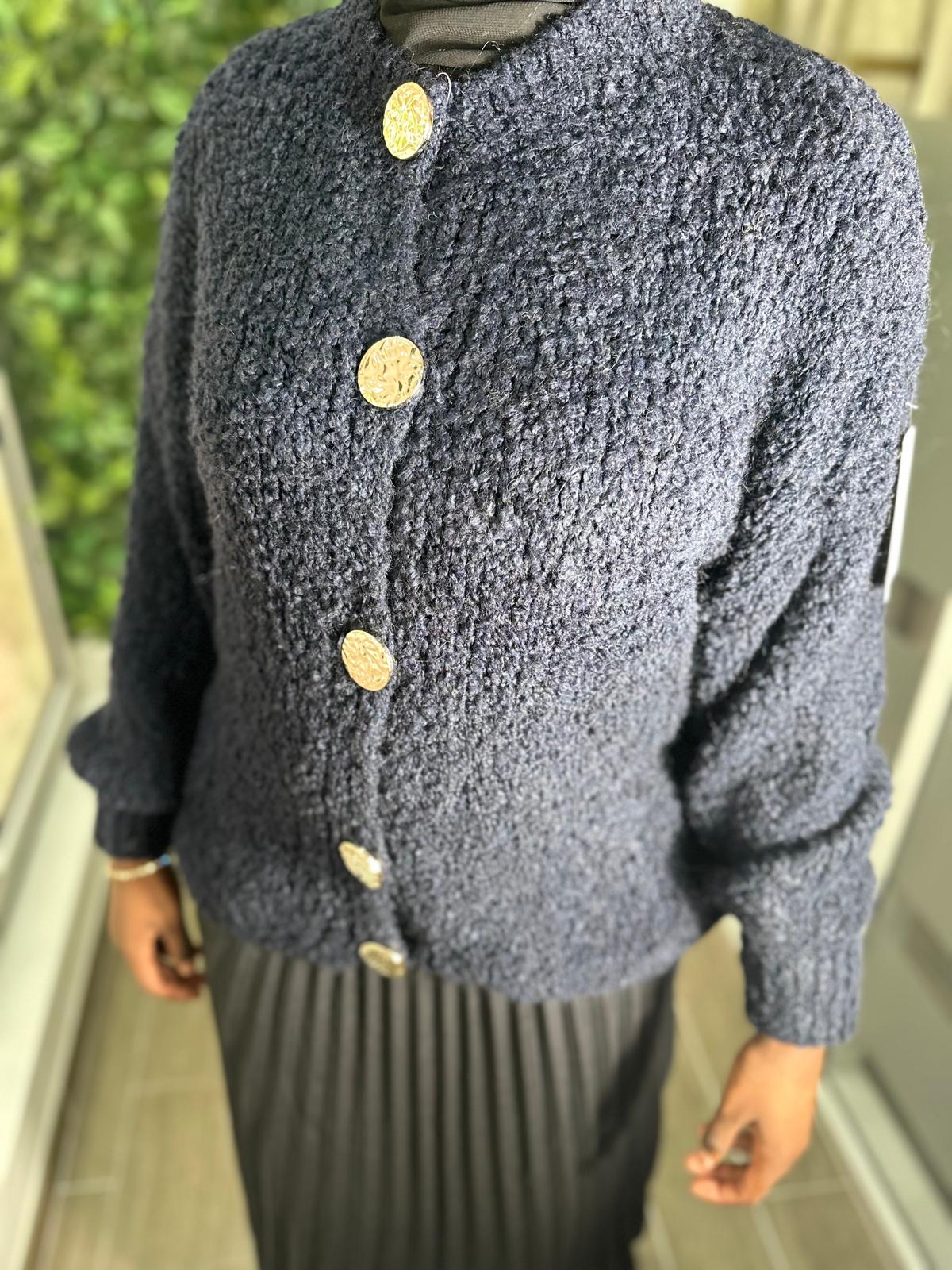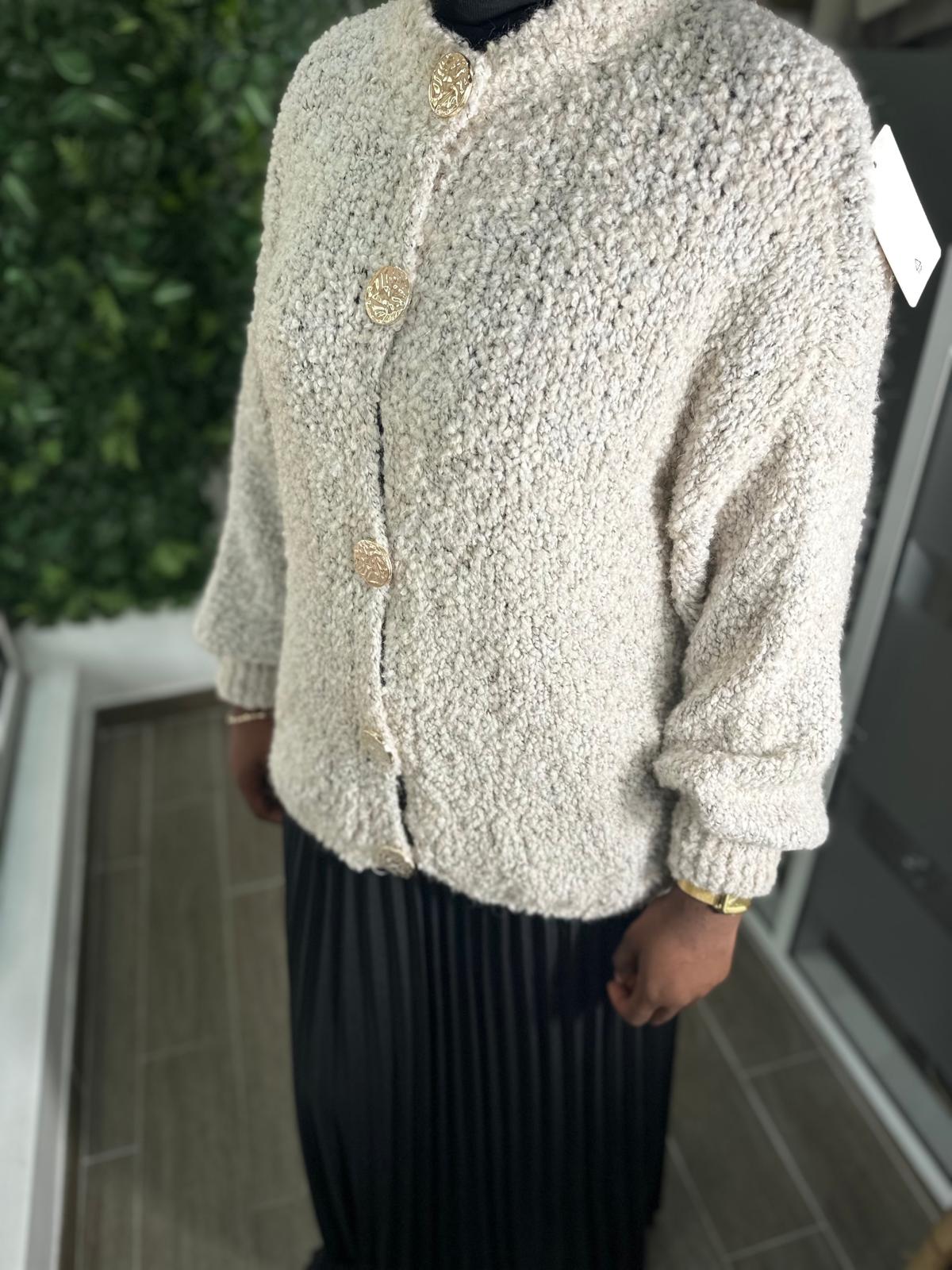 Sa maille texturée et ses gros boutons apportent une touche d’originalité tout en assurant confort et chaleur.