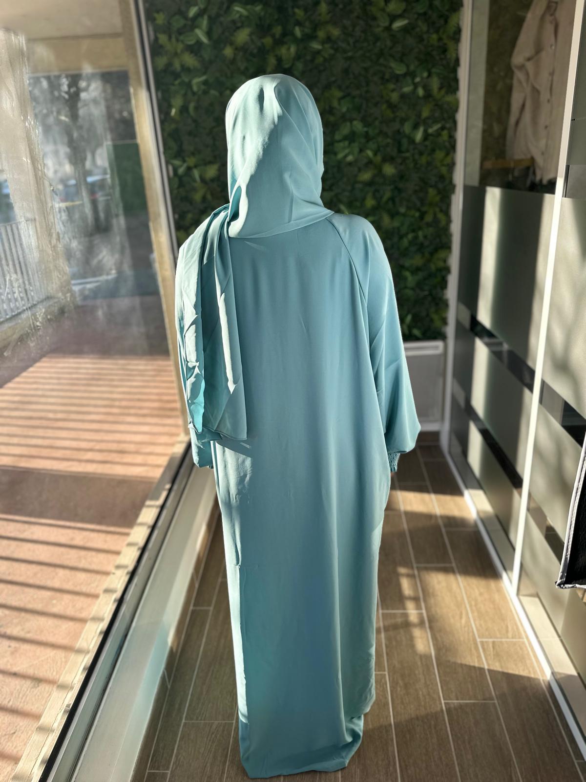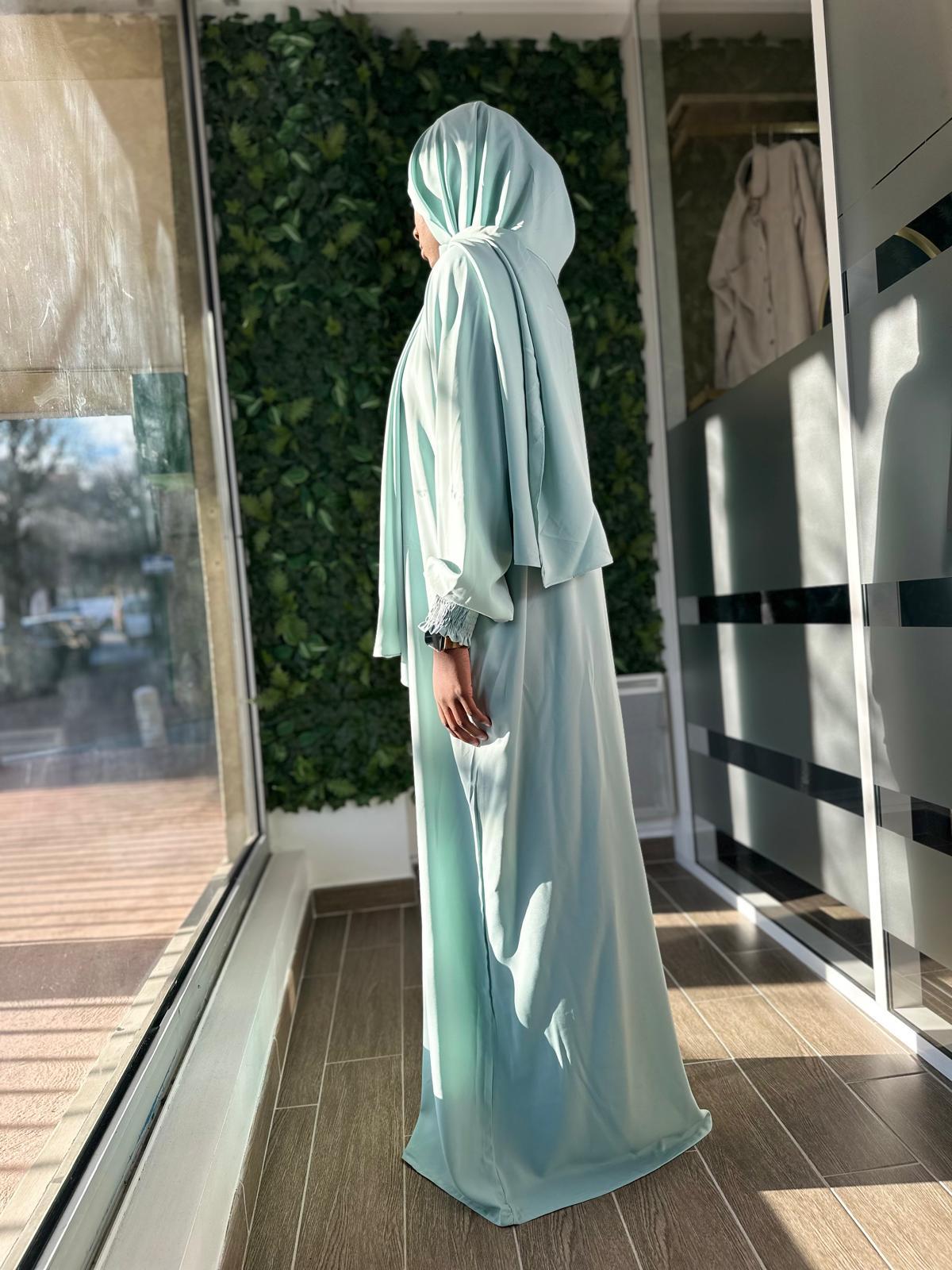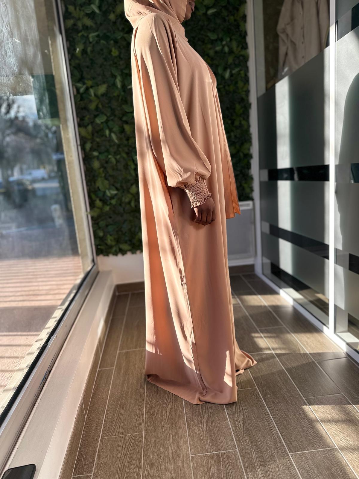 Cette abaya fluide avec voile intégré est le parfait compromis entre élégance, pudeur et confort. Confectionnée dans un tissu léger et soyeux, elle tombe avec grâce tout en offrant une grande liberté de mouvement. Ses poignets smockés et son hijab intégré en font une pièce à la fois pratique et raffinée, idéale pour les occasions spéciales comme pour le quotidien.