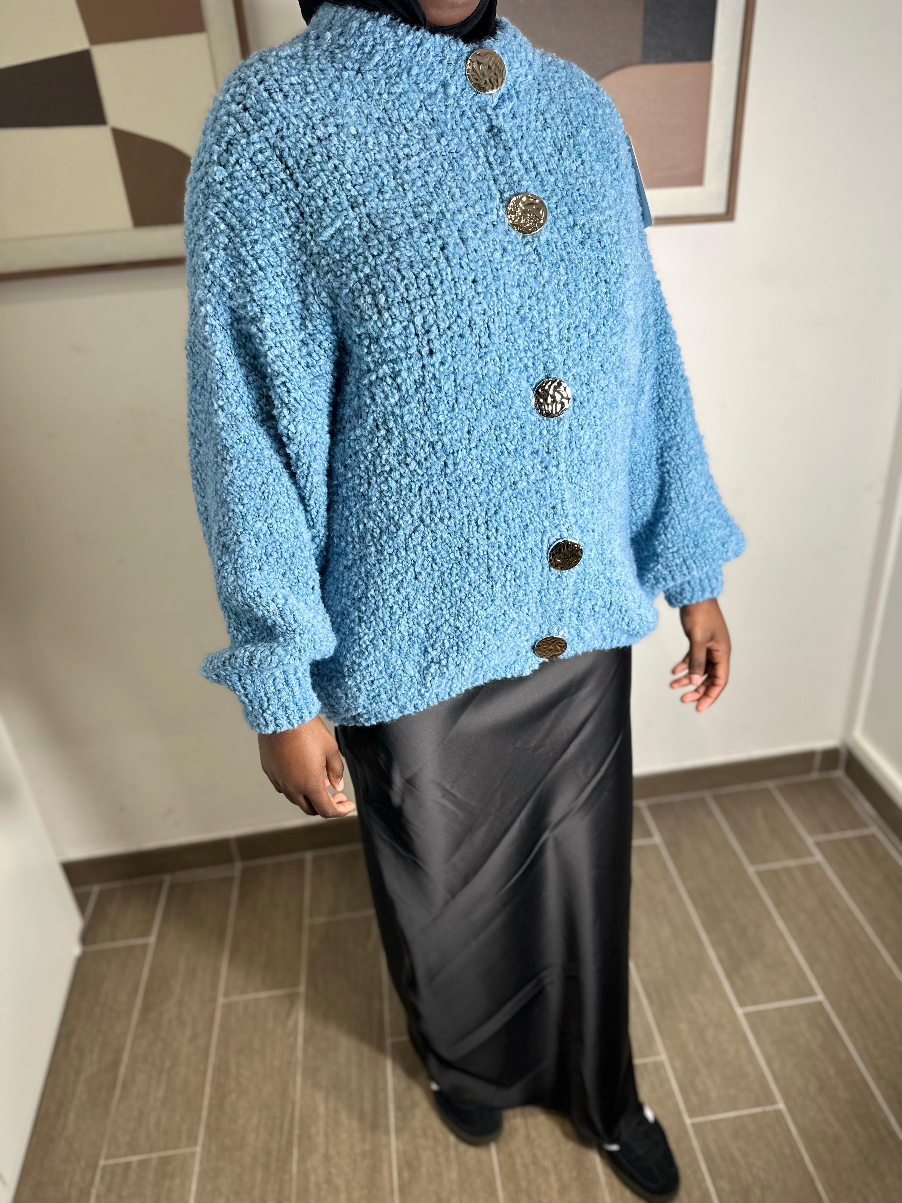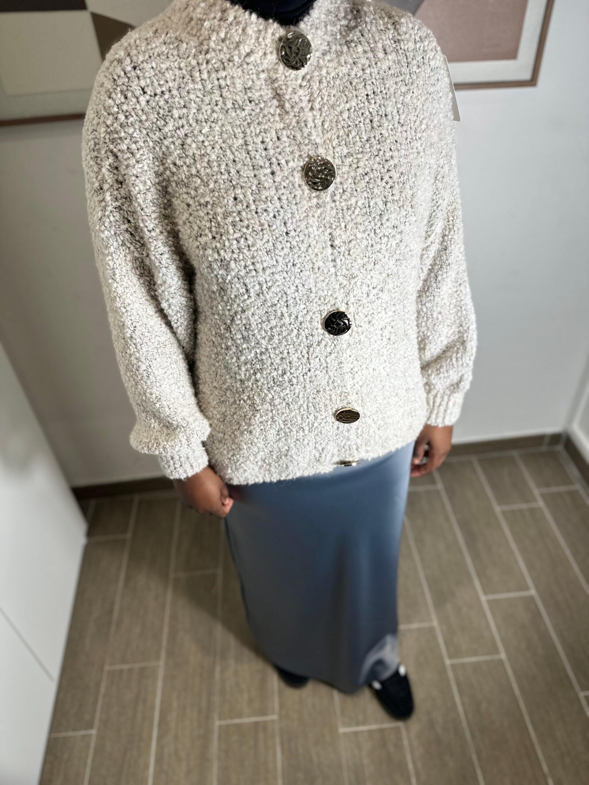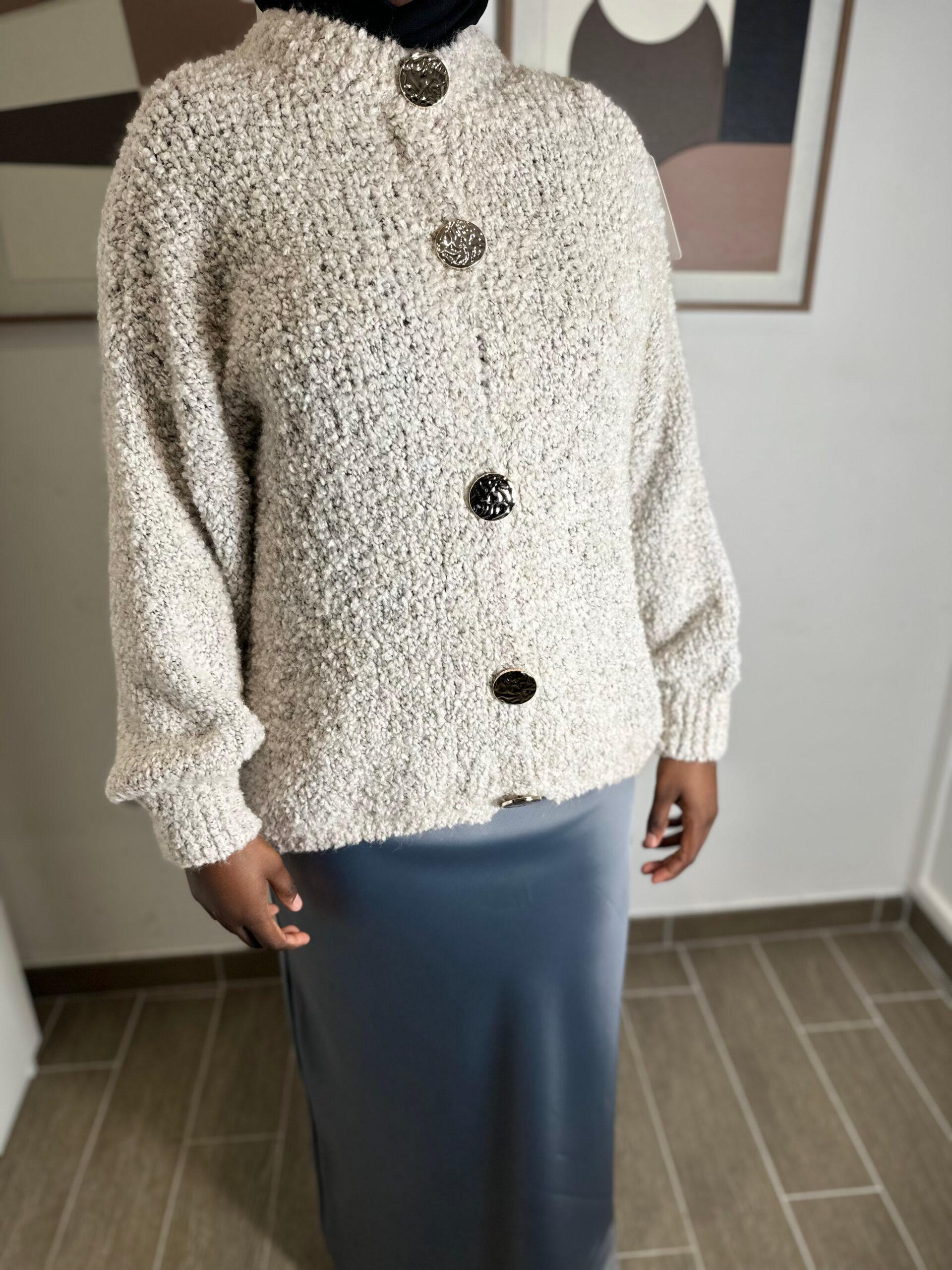 Sa maille texturée et ses gros boutons apportent une touche d’originalité tout en assurant confort et chaleur.