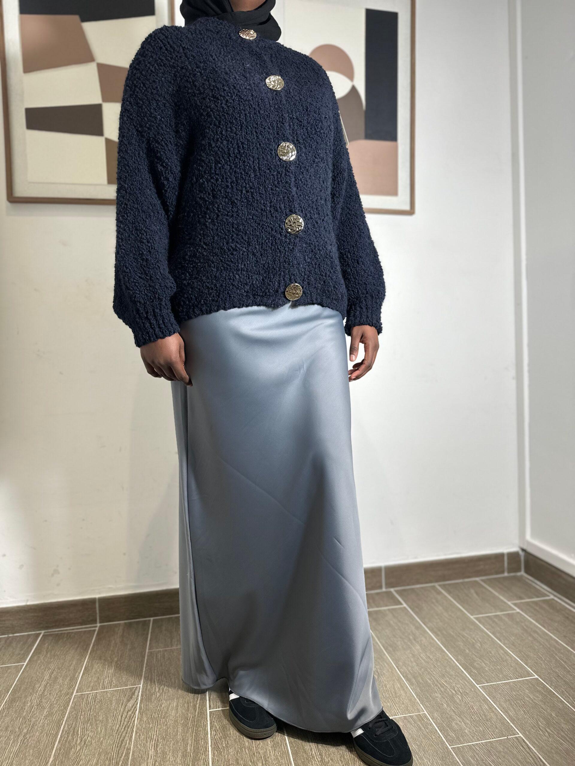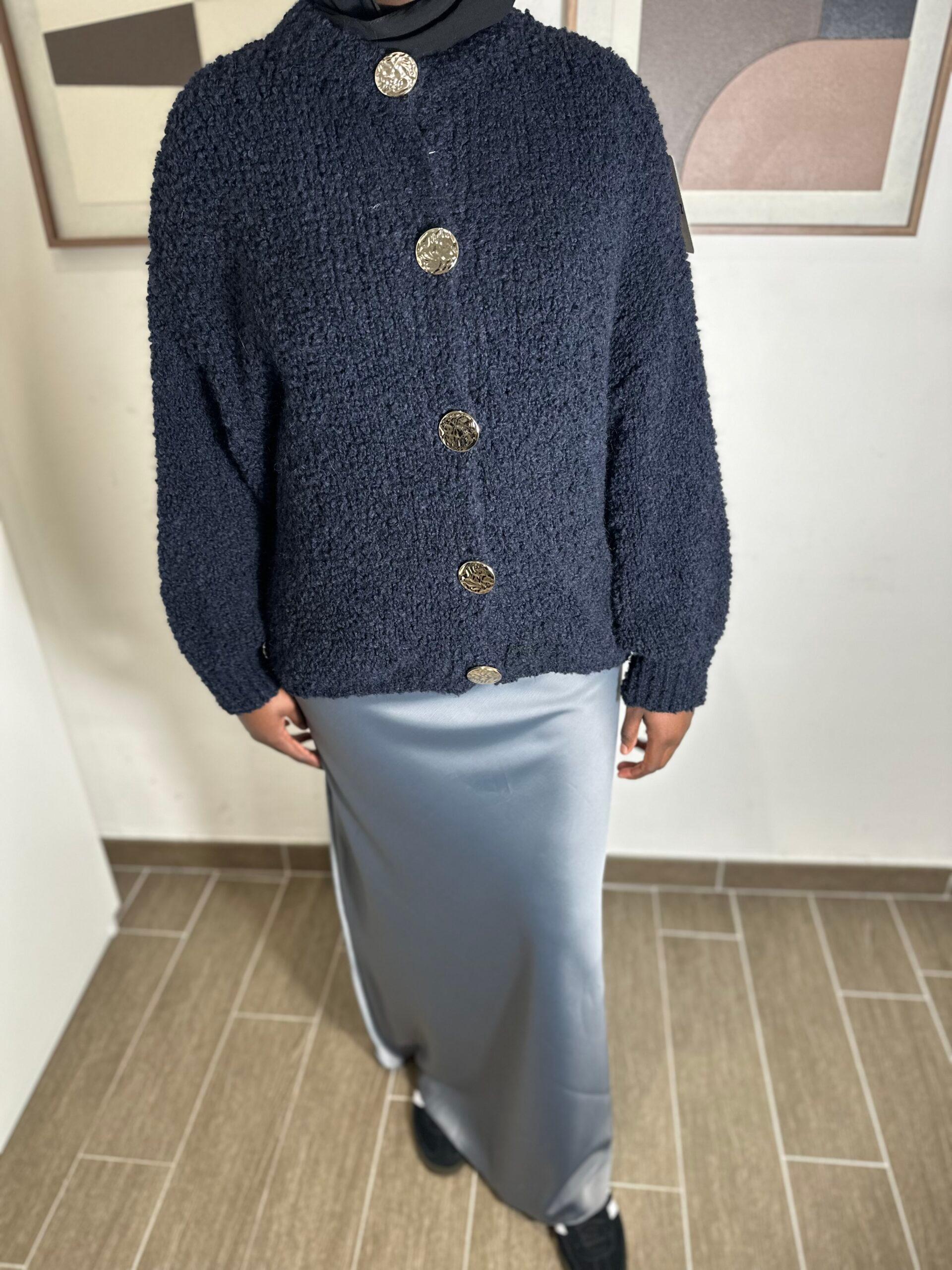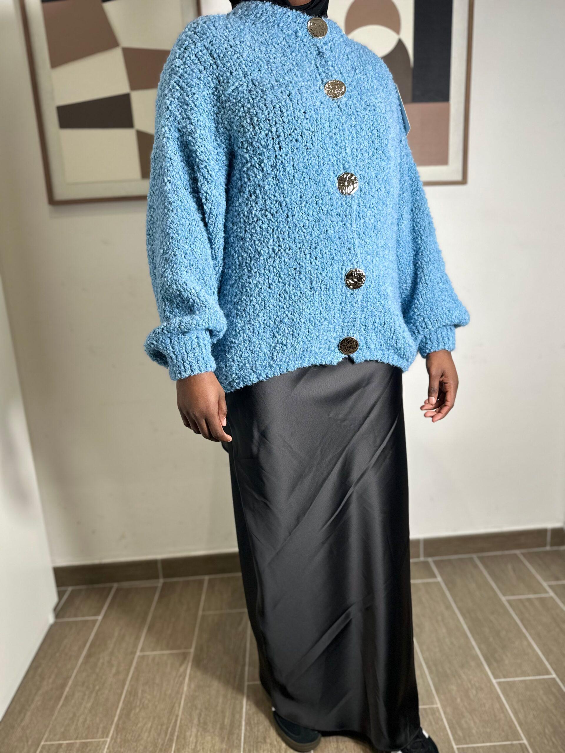 Sa maille texturée et ses gros boutons apportent une touche d’originalité tout en assurant confort et chaleur.