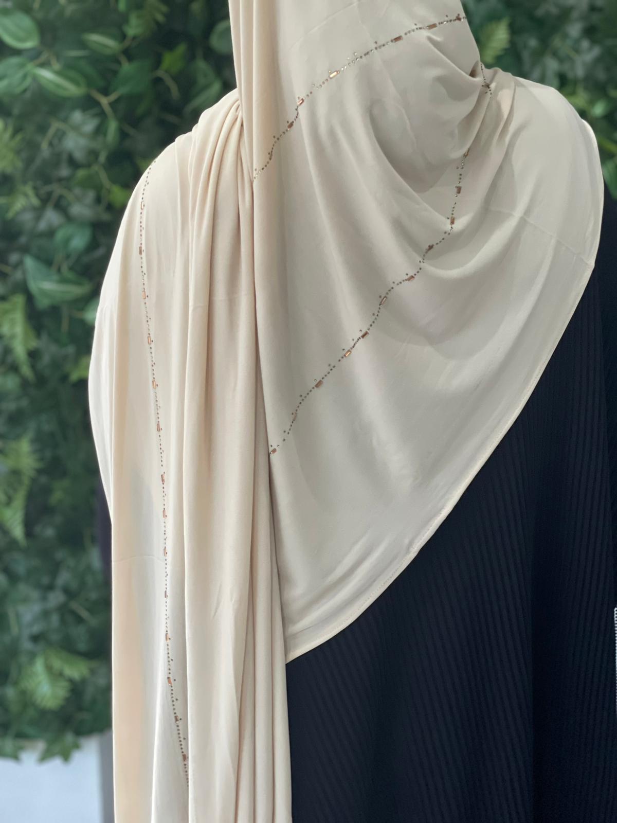 Hijab jersey pailleté : voile doux, extensible et brillant.Confortable à porter avec une touche élégante grâce aux paillettes.