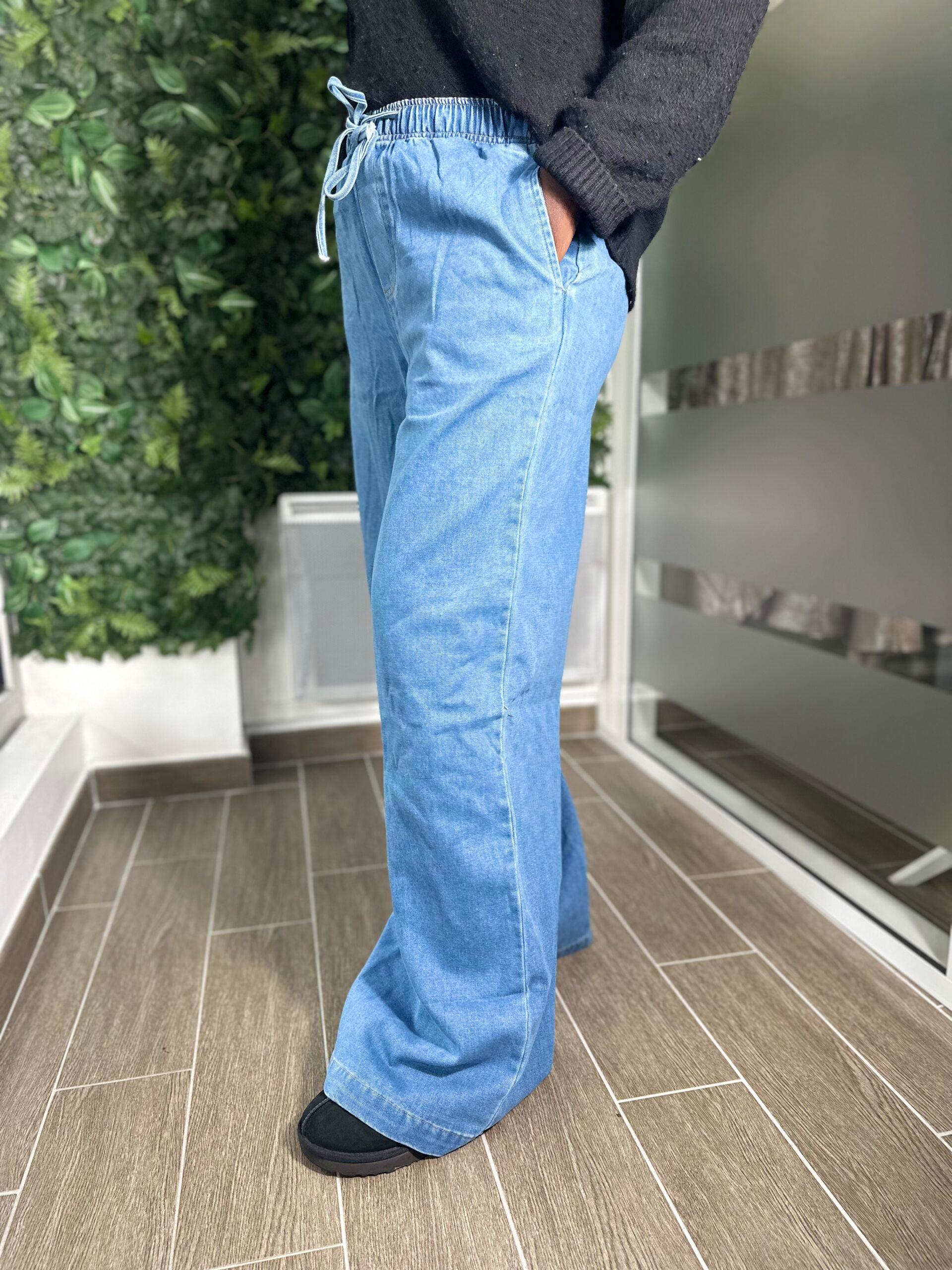 Confortable et tendance, ce pantalon en jean clair à taille élastique et cordon de serrage est un indispensable pour un look décontracté.