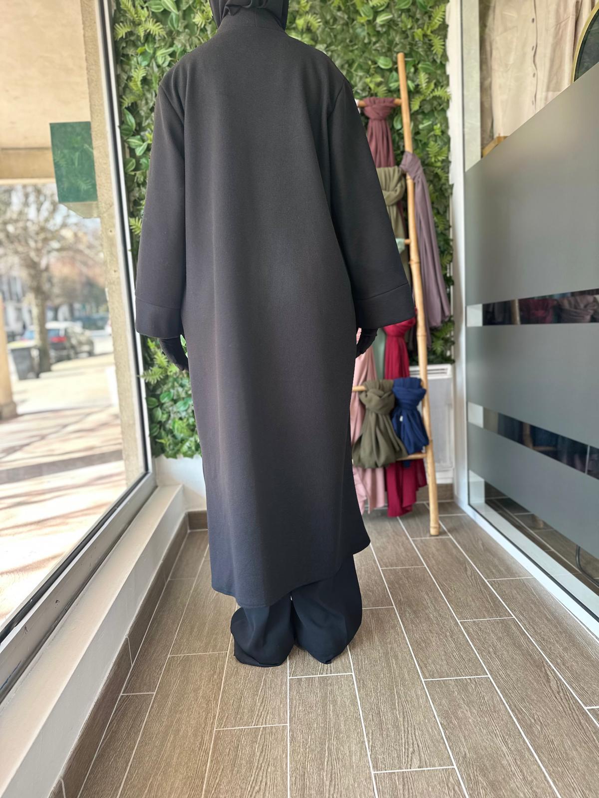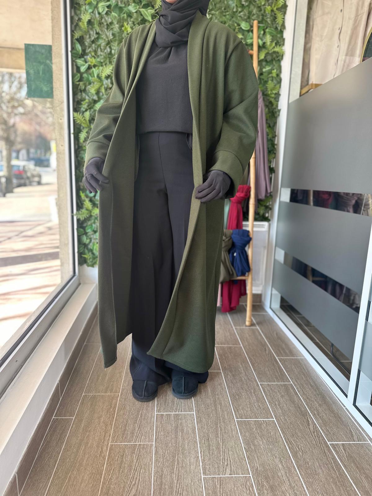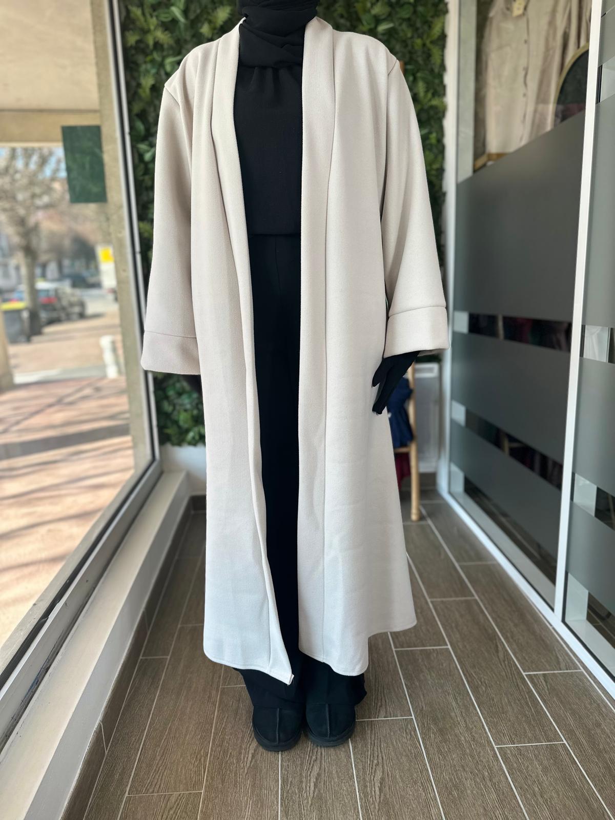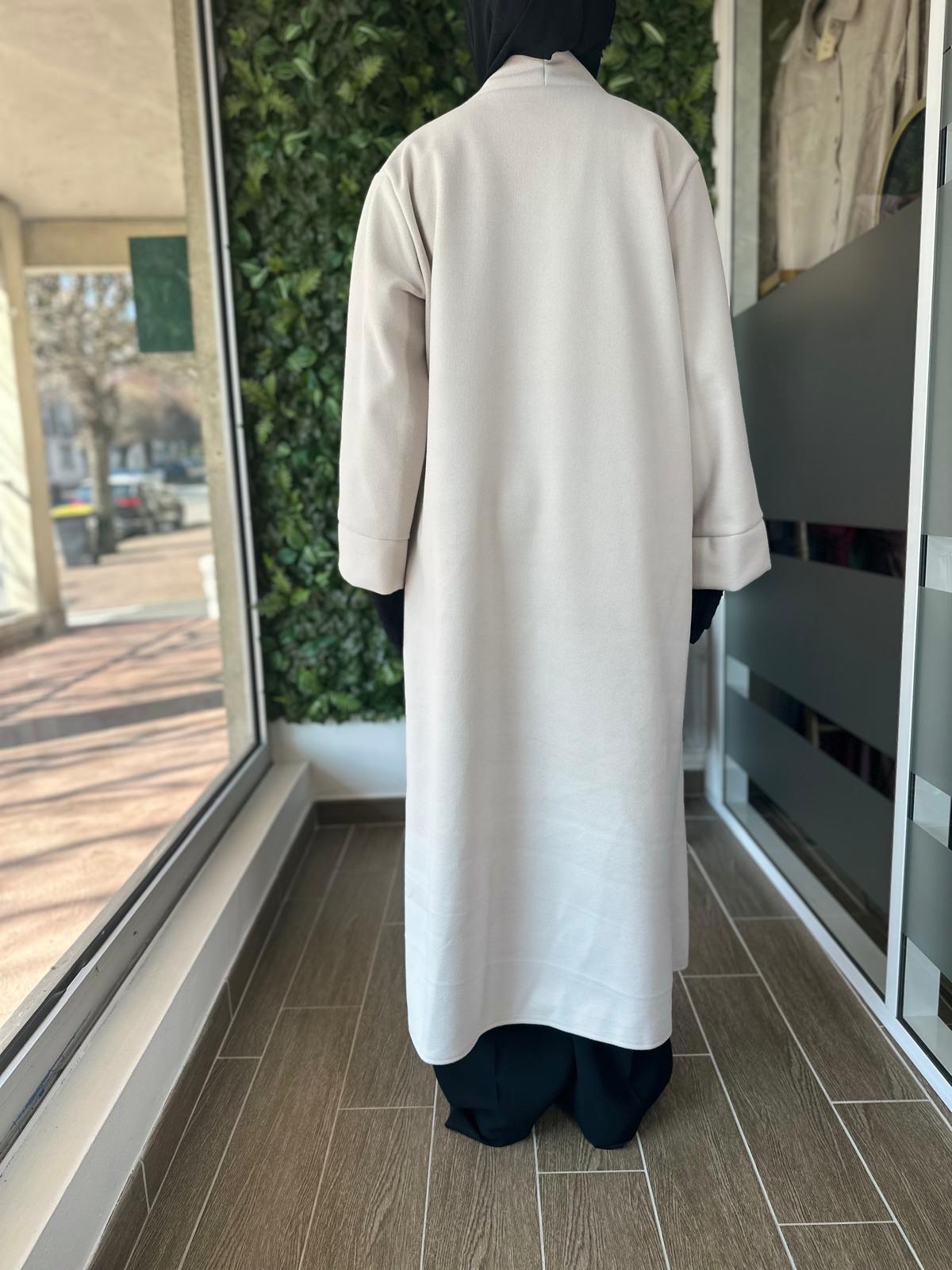 Ce manteau long fluide au tomber élégant est parfait pour la mi-saison ou les journées fraîches sur une abaya, une robe ou un ensemble. Avec sa coupe ample et son tissu léger au toucher doux, il allie confort et raffinement. Il s’enfile facilement sur toutes vos tenues et apporte une touche de classe sans effort.